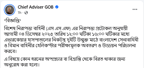 বিজ্ঞপ্তিতে জানানো হয়, বিশেষ নিরাপত্তা বাহিনী (এসএসএফ) নির্ধারিত নিরাপত্তা প্রটোকলের অংশ হিসেবে বুধবার (৪ ডিসেম্বর) দুপুর ১২টা থেকে বিকেল ৪টার মধ্যে এই কার্যক্রম চলবে। একই সঙ্গে পরীক্ষামূলক উড্ডয়নকে কেন্দ্র করে যেকোনো ধরনের অপপ্রচার বা বিভ্রান্তি ছড়ানো থেকে বিরত থাকার আহ্বান জানানো হয়েছে।