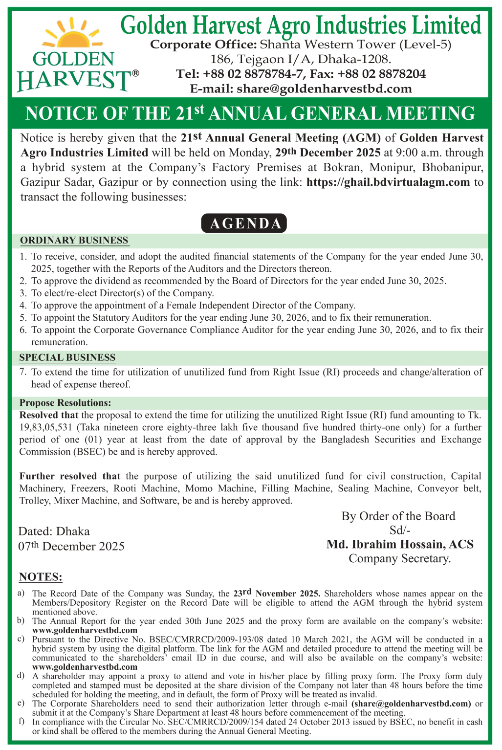 Homeপ্রাইস সেনসিটিভ ইনফরমেশনNotice of The 21st Annual General Meeting of Golden Harvest Agro Industries...