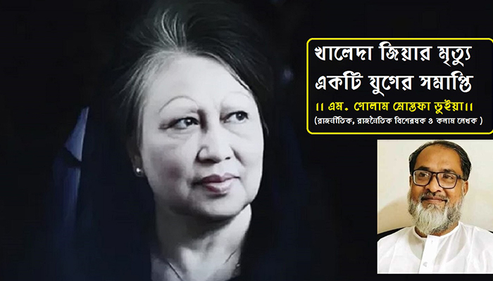 খালেদা জিয়ার ইন্তেকাল বাংলাদেশের রাজনীতিতে একটি দীর্ঘ ও প্রভাবশালী অধ্যায়ের সমাপ্তি। তিনি ছিলেন বাংলাদেশের প্রথম নারী প্রধানমন্ত্রী, যিনি জাতীয়তাবাদী ও ধর্মীয় রাজনীতির ধারাকে প্রতিনিধিত্ব করতেন এবং দেশের স্বাধীনতা ও সার্বভৌমত্বের পক্ষে দৃঢ় অবস্থান তাকে আজীবন স্মরণীয় করে রাখবে। তিনি ছিলেন বাংলাদেশের প্রথম নারী প্রধানমন্ত্রী, তিনবারের সরকারপ্রধান, এবং বাংলাদেশ জাতীয়তাবাদী দল (বিএনপি)-এর দীর্ঘদিনের চেয়ারপারসন। তাঁর রাজনৈতিক জীবন ছিল সংগ্রামে ভরা, দ্বন্দ্বে জর্জরিত, কিন্তু একই সঙ্গে ইতিহাস গড়া এক অধ্যায়। তাঁর অনুপস্থিতি শুধু একটি রাজনৈতিক দলের জন্য নয়, সমগ্র জাতির রাজনৈতিক ইতিহাসে এক শূন্যতা তৈরি করেছে। তিনি বাংলাদেশের রাজনৈতিক ইতিহাসের এক প্রভাবশালী অধ্যায়। যা বাংলাদেশের ইতিহাসে চিরস্মরণীয় হয়ে থাকবে। তিনি শুধু একটি দলের নেতা ছিলেন না, তিনি ছিলেন একটি সময়, একটি সংগ্রাম এবং একটি মতাদর্শের প্রতীক।