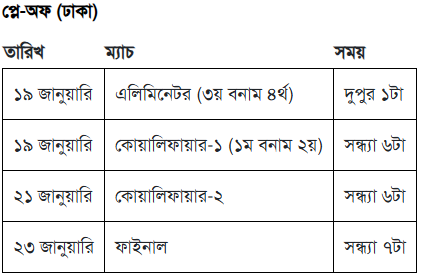 সিলেট পর্ব শেষে প্লে–অফের চিত্র অনেকটাই স্পষ্ট। শেষ ম্যাচে ঢাকা ক্যাপিটালসকে হারানোর পর রাজশাহী ওয়ারিয়র্স, চট্টগ্রাম রয়্যালস ও সিলেট টাইটান্স এই তিন দল নিশ্চিত করেছে শেষ চারে জায়গা। ফলে ঢাকায় বাকি লিগ ম্যাচগুলোতে মূল লড়াই হবে চতুর্থ প্লে–অফ টিকিট নিয়ে।