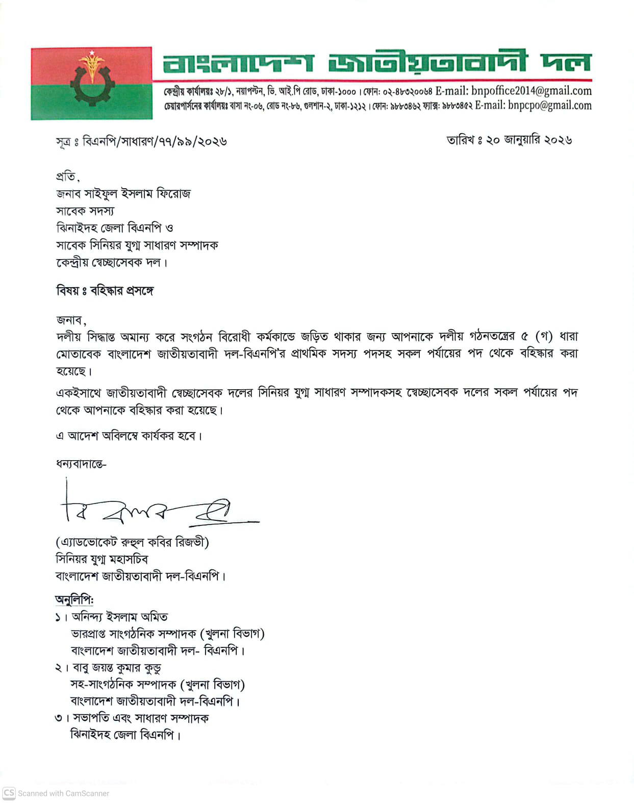 ঝিনাইদহ জেলা বিএনপির কাছে পাঠানো বিজ্ঞপ্তিতে উল্লেখ করা হয়, দলীয় শৃঙ্খলা ভঙ্গ এবং সংগঠনবিরোধী কর্মকাণ্ডে জড়িত থাকার কারণে সাইফুল ইসলাম ফিরোজের বিএনপির প্রাথমিক সদস্য পদসহ সকল পর্যায়ের পদ থেকে বহিষ্কার করা হয়েছে। একই সঙ্গে তাকে জাতীয়তাবাদী স্বেচ্ছাসেবক দল কেন্দ্রীয় কমিটির সিনিয়র যুগ্ম সাধারণ সম্পাদক পদসহ স্বেচ্ছাসেবক দলের সকল পর্যায়ের পদ থেকেও বহিষ্কার করা হয়েছে বলে বিজ্ঞপ্তিতে উল্লেখ করা হয়।