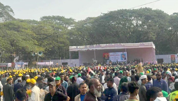 বৃহস্পতিবার সকাল থেকে মাঠ ও সংলগ্ন সড়কগুলোতে মানুষের উপস্থিতি আরও বাড়তে থাকে। নির্ধারিত সময়ের আগেই মাঠের একটি বড় অংশ জনসমুদ্রে পরিণত হয়।