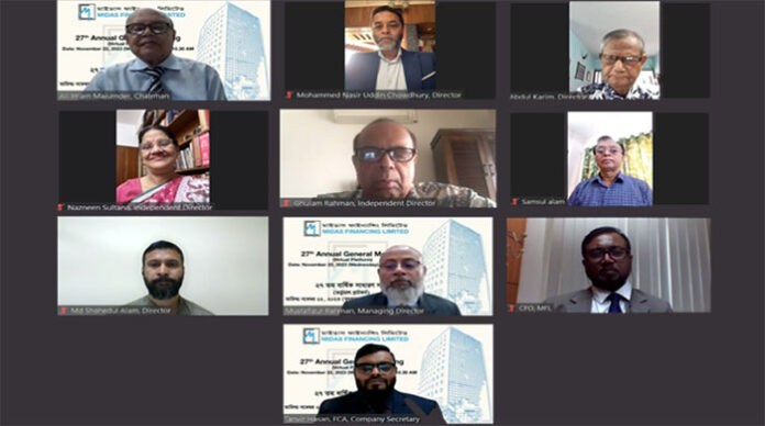 নিজস্ব প্রতিবেদক : পুঁজিবাজারে তালিকাভুক্ত কোম্পানি মাইডাস ফাইন্যান্সিং লিমিটেডের ২৭তম বার্ষিক সাধারণ সভা (এজিএম) অনুষ্ঠিত হয়েছে। সম্প্রতি ডিজিটাল (ভার্চুয়াল) প্লাটফর্মে অনুষ্ঠিত সভায় ৩১ ডিসেম্বর, ২০২২ তারিখে সমাপ্ত বছরের জন্য ১.৫ শতাংশ নগদ লভ্যাংশ সর্বসম্মতভাবে অনুমোদিত হয়।
