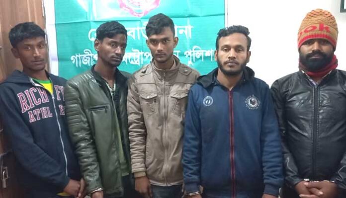 গ্রেফতারকৃতরা হলো- নেত্রকোনা জেলার পূর্বধলা থানা হোগলা সাধুপাড়া গ্রামের ইসলাম উদ্দিন এর ছেলে সোহেল রানা (২৭), জামালপুর জেলার মাদারগঞ্জ থানার মদন গোপাল মৃত্যু শরিফ উদ্দিনের ছেলে মোহাম্মদ ওসমান মিয়া (২৫), জামালপুর জেলার সদর থানার জঙ্গলপাড়া গ্রামের মোঃ মাসুদ হোসেনের ছেলে বাবুল (২৫), গাইবান্ধা জেলার গোবিন্দগঞ্জ থানার তরফমনো গ্রামের নুর সালাম মিয়ার ছেলে রায়হান (২৪) ও গাইবান্ধা জেলার গোবিন্দগঞ্জ থানা তালুক রহিমাপুর গ্রামের আয়নাল হক এর ছেলে মোঃ হাসান (২৩)।