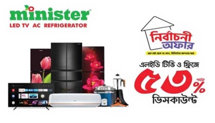 কর্পেোরেট ডেস্ক: বাংলাদেশের জাতীয় সংসদ নির্বাচন নিয়ে দেশজুড়ে ইতোমধ্যে শুরু হয়ে গিয়েছে নানান তোড়জোড়। পুরো দেশই যেন নির্বাচনী উত্তাপ আর উৎসবে মেতে উঠেছে। আর এই নির্বাচনী উত্তাপ এবং আমেজকে আরও বাড়িয়ে দিতে দেশের জনপ্রিয় ইলেকট্রনিকস কোম্পানি মিনিস্টার নিয়ে এলো বহুল আলোচিত ‘নির্বাচনী অফার’ যেখানে মিনিস্টারের এলইডি টিভি ও ফ্রিজ ক্রয়ে গ্রাহক পাচ্ছেন ৫৩% পর্যন্ত ডিসকাউন্ট! এছাড়াও থাকছে সকল পণ্যের উপর ০% ডাউন পেমেন্টে সহজ কিস্তি সুবিধা।