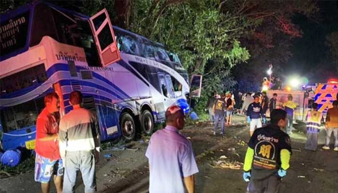 সোমবার রাতে উপকূলীয় প্রচুয়াপ খিরি খান প্রদেশে দূরপাল্লার বাসটি ব্যাঙ্কক থেকে রাজ্যের দক্ষিণে যাওয়ার সময় গাছের সাথে ধাক্কা লেগে দু’ভাগে বিভক্ত হয়ে পড়ে। গাছটি এখনও মাঝখানে আটকে আছে।