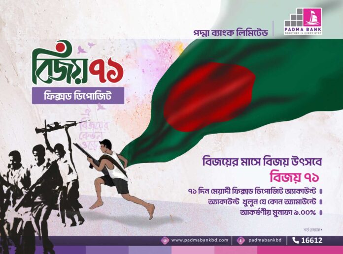 কর্পোরেট ডেস্ক: মহান বিজয়ের মাসে পদ্মা ব্যাংকের জয়োৎসব শুরু হলো নতুন পণ্য বিজয় ৭১-এর মোড়ক উন্মোচনের মধ্য দিয়ে। বিজয় আয়োজনে সবার চেতনায় ধ্বনিত হচ্ছে মুক্তিযুদ্ধের বিজয়গাঁথার স্মৃতিচারণ আর বীর শহীদদের প্রতি শ্রদ্ধা ও ভালোবাসা। তেমনি পদ্মা ব্যাংকও বিজয় উদযাপন করতে, মাত্র ৭১ দিনে ৯% হারে ফিক্সড ডিপোজিট করার সুযোগ নিয়ে এলো গ্রাহকদের জন্য।