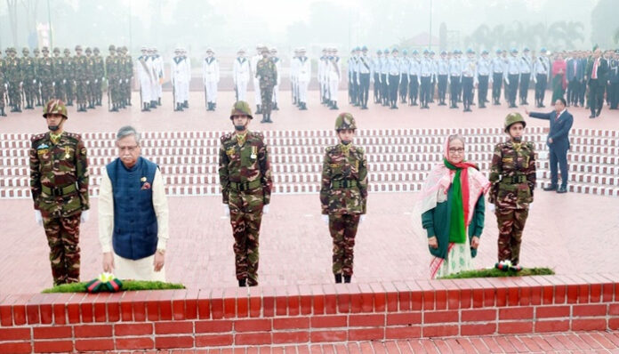 শনিবার (১৬ ডিসেম্বর) ভোর ৬টা ৩৩ মিনিটে সূর্যোদয়ের সঙ্গে সঙ্গে জাতীয় স্মৃতিসৌধের বেদিতে প্রথমে পুষ্পস্তবক অর্পণ করেন রাষ্ট্রপ্রধান। এর পরপরই মাননীয় প্রধানমন্ত্রী শেখ হাসিনা সেখানে পুষ্পস্তবক অর্পণ করেন।