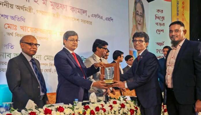 ওয়ালটন প্লাজার পক্ষে ওয়ালটন প্লাজার ব্যবস্থাপনা পরিচালক মোহাম্মদ রায়হান সম্মাননা ও জাতীয় ট্যাক্স কার্ড গ্রহণ করেছেন।
