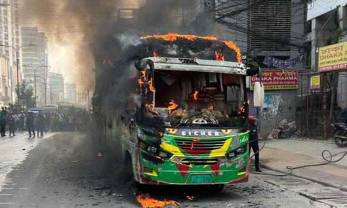 নিজস্ব প্রতিবেদক: রাজধানীর জুরাইন সালাউদ্দিন পাম্পের পাশে রাইদা পরিবহনের একটি বাসে আগুন দেয়া হয়েছে। আজ রোববার বেলা ২টা ৪০ মিনিটে আগুনের খবর পেয়ে ২টা ৪৩ মিনিটে ফায়ার সার্ভিস ঘটনাস্থলে পৌঁছায়।