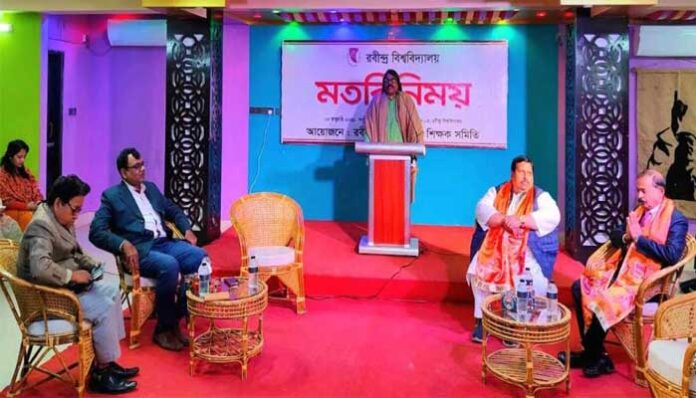 মতবিনিময়ে রবীন্দ্র বিশ্ববিদ্যালয়ের সকল বিভাগের চেয়ারম্যান, শিক্ষক, শিক্ষার্থী, কর্মকর্তা, কর্মচারিবৃন্দ উপস্থিত ছিলেন।’
