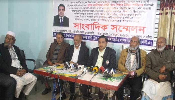 নোয়াখালী প্রতিনিধি: নোয়াখালী-৪ (সদর-সুবর্ণচর) আসনে নির্বাচন পরবর্তী শতাধিক কর্মী-সমর্থকদের মারধর ও পিটিয়ে আহত, বাড়িঘর-ব্যবসা প্রতিষ্ঠানে বোমা হামলা, ভাংচুর ও তালা দেয়ার প্রতিবাদে এবং প্রায় ৪২জন প্রিসাইডিং কর্মকতার বিরুদ্ধে পক্ষপাতিত্বের অভিযোগ এনে সাংবাদিক সম্মেলন করেছেন ট্রাক প্রতীকের পরাজিত স্বতন্ত্র প্রার্থী ও জেলা আওয়ামী লীগের সিনিয়র সহসভাপতি এডভোকেট মো. শিহাব উদ্দিন শাহিন।