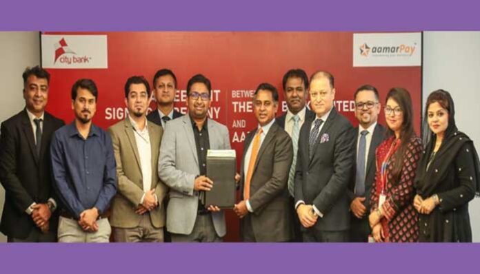 সিটি ব্যাংকের অতিরিক্ত ব্যবস্থাপনা পরিচালক ও প্রধান ব্যবসায় কর্মকর্তা শেখ মোহাম্মদ মারুফ এবং আমার পে-র ব্যবস্থাপনা পরিচালক ও প্রতিষ্ঠাতা এ এম ইশতিয়াক সারোয়ার নিজ নিজ প্রতিষ্ঠানের পক্ষে চুক্তিপত্রে স্বাক্ষর করেন।