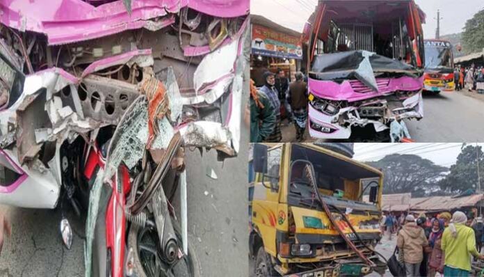 পুলিশ ও স্থানীয়রা জানান, সোমবার সকালে ঢাকা থেকে বরকত পরিবহনের বেপরোয়া গতির একটি বাস রংপুরের দিকে যাচ্ছিল। পরে পথে চৌমাথা মোড়ে বাসটি দুটি মোটরসাইকেলকে ধাক্কা দেয়। এ সময় নিয়ন্ত্রণহীন বাসটির সঙ্গে বিপরীতমুখী পণ্যবাহী একটি ট্রাকের সংঘর্ষ ঘটে। এদিকে স্থানীয়রা তিনজনকে উদ্ধার করে স্বাস্থ্য কমপ্লেক্সে নিলে চিকিৎসক মৃত ঘোষণা করেন।