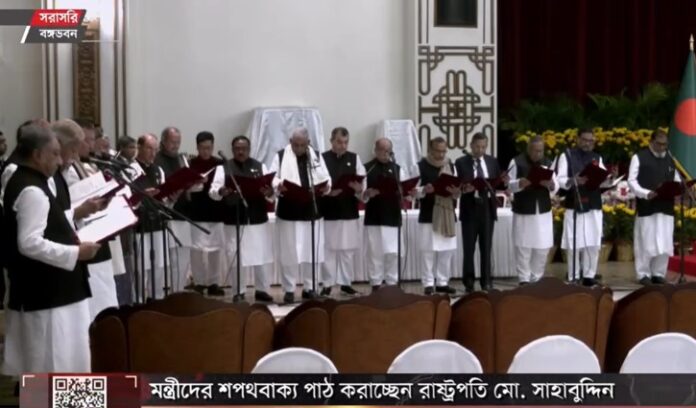 এর আগে প্রধানমন্ত্রী হিসেবে পঞ্চমবারের মতো শপথ নেন শেখ হাসিনা। পরে মন্ত্রীদের শপথবাক্য পাঠ করানো হয়। সবশেষে প্রতিমন্ত্রীরা শপথবাক্য পাঠ করেন।