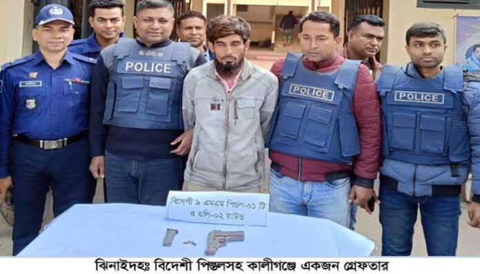 আতিকুর রহমান, ঝিনাইদহ প্রতিনিধি: ঝিনাইদহের কালীগঞ্জ থেকে বিদেশী অস্ত্র ও গুলিসহ রাজন বিশ্বাস রাজু নামে এক ব্যক্তিকে গ্রেফতার করেছে পুলিশ।
