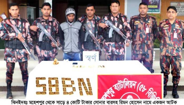 আতিকুর রহমান, ঝিনাইদহ প্রতিনিধি: ঝিনাইদহের মহেশপুর উপজেলার মাটিলা গ্রাম থেকে সাড়ে চার কেজিরও বেশি সোনার বার জব্দ করেছে বিজিবি। উদ্ধারকৃত সোনার বারের মুল্য চার কোটি পাঁচ লক্ষ নিরানব্বই হাজার চারশত একাত্তর টাকা।