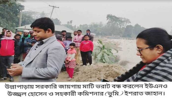 জবর-দখল করে সরকারী জায়গাতে মাটি ভরাটে সড়ক ও জনপদ (সওজ) থেকে কোন প্রকার লীজ নেওয়া হয়নি তাদের। রাতের অন্ধকারে মাটি ভরাট করে জায়গা দখল করার অভিযোগ উঠেছে উপজেলার পূর্বদেলুয়া গ্রামের আলহাজ্ব রমজান আলীর ছেলে নজরুল ইসলাম, রমজানের ভাতিজা আমিরুল ইসলাম ও আলহাজ্ব নুরুল ইসলামের ছেলে ইউনুস আলীর বিরুদ্ধে। স্থানীয় জনগণের অভিযোগের প্রেক্ষিতে গত সোমবার সন্ধ্যায় উপজেলা নির্বাহী কর্মকর্তা মোঃ উজ্জল হোসেন ও উল্লাপাড়া সহকারী কমিশনার (ভুমি) ইশরাত জাহান সরেজমিনে পরিদর্শন করে এলাকাবাসীর সামনে সরকারি জায়গায় মাটি ভরাটের কাজ বন্ধ করেন।