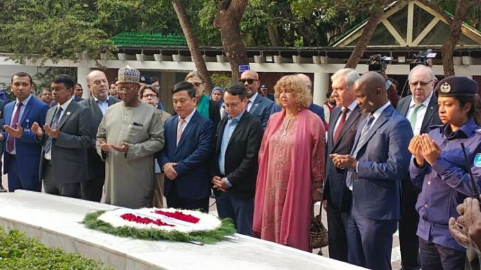 পরে তারা বেদীর পাশে নীরবে কিছুক্ষণ দাঁড়িয়ে থাকেন। এরপর বঙ্গবন্ধুসহ মহান মুক্তিযুদ্ধে আত্মদানকারী ৩০ লাখ শহীদের আত্মার শান্তি কামনায় বিশেষ দোয়া ও মোনাজাতে অংশ নেন তারা। এরপর রাষ্ট্রদূতরা বঙ্গবন্ধু সমাধি সৌধের প্রশাসনিক ভবনে যান। সেখানে পরিদর্শন বইতে তারা সই করেন।