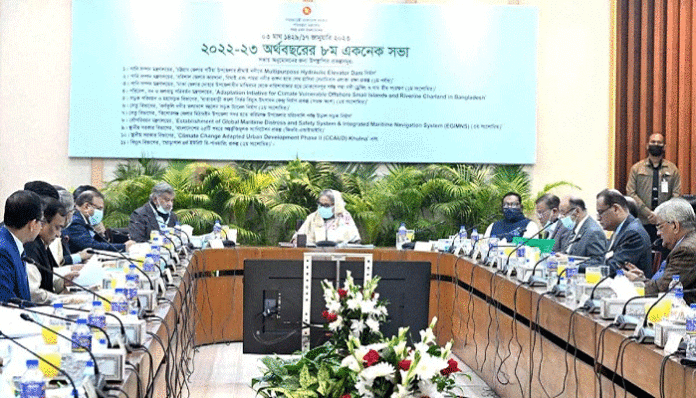 চট্টগ্রাম জেলার পটিয়া উপজেলার শ্রীমাই নদীতে নির্মাণ প্রকল্প (ব্যয় ধরা হয়েছে ১৩৩ কোটি ৫৩ লাখ টাকা), বরিশাল জেলার কারখানা বিঘাই এবং পায়রা নদীর ভাঙন থেকে শেখ হাসিনা সেনানিবাস এলাকা রক্ষা প্রকল্প (ব্যয় ধরা হয়েছে ৬৭৬ কোটি টাকা), ঢাকা জেলার দোহার উপজেলাধীন মাঝিরচর থেকে নারিশাবাজার হয়ে মোকসেদপুর পর্যন্ত পদ্মা নদী ড্রেজিং ও বাম তীর সংরক্ষণ প্রকল্প (ব্যয় ধরা হয়েছে ৫২৮ কোটি টাকা), বাংলাদেশ জলবায়ু ঝুঁকিপূর্ণ উপকুলীয় ছোট দ্বীপ এবং নদীর চরের জন্য অভিযোজন উদ্যোগ প্রকল্প (ব্যয় ধরা হয়েছে ৭৭ কোটি ৮৬ লাখ টাকা), মাতারবাড়ী কয়লা নির্ভর বিদ্যুৎ উৎপাদন কেন্দ্র নির্মাণ প্রকল্প (ব্যয় ধরা হয়েছে ৩৬৪ কোটি ৮১ লাখ টাকা), কর্ণফুলী নদীর তলদেশে বহুলেন সড়ক টানেল নির্মাণ প্রকল্প (ব্যয় ধরা হয়েছে ৩১৫ কোটি ২৯ লাখ টাকা), কিশোরগঞ্জ জেলার মিঠামইন উপজেলা সদর থেকে করিমগঞ্জ উপজেলার মচিখালি পর্যন্ত উড়াল সড়ক নির্মাণ প্রকল্প (ব্যয় ধরা হয়েছে ৫ হাজার ৬৫১ কোটি ১৩ লাখ টাকা), ইস্টাবিলিশমেন্ট অব গ্লোবার মেরিটাইম ডিজট্রিজ অ্যান্ড সেফলি সিস্টেম অ্যান্ড ইন্টারগ্রেটেড মেরিটাইম নেভিগেশন সিস্টেম প্রকল্প (ব্যয় ধরা হয়েছে ৯২ কোটি ৪৬ লাখ টাকা), বাংলাদেশে ২৫টি শহরে অন্তর্ভুক্তিমূলক স্যানিটেশন প্রকল্প (ব্যয় ধরা হয়েছে ২ হাজার ২১০ কোটি ৭০ লাখ টাকা) অনুমোদন দেওয়া হয়েছে।