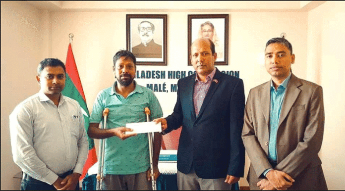 মো. ওমর ফারুক অনিক, মালদ্বীপ প্রতিনিধি : মালদ্বীপে নির্মাণ কাজ করার সময় পায়ে গুরুতর আঘাত প্রাপ্ত ঢাকা, কেরানীগঞ্জের প্রবাসী বাংলাদেশি কর্মী মীরজাহান মিঞাকে দেশে ফিরে যাওয়ার জন্য ওয়েজ আর্নার্স কল্যাণ তহবিল হতে একটি বিমান টিকেট হস্তান্তর করেন মালদ্বীপে নিযুক্ত বাংলাদেশ হাইকমিশনার রিয়ার এডমিরাল এস এম আবুল কালাম আজাদ। এ-সময় হাইকমিশনের প্রথম সচিব ও কাউন্সিলর (শ্রম) মো. সোহেল পারভেজ ও কল্যাণ সহকারী মো. জসিম উদ্দিন উপস্থিত ছিলেন।