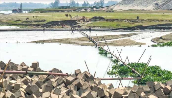 সরেজমিনে দেখা যায়, জেলা আওয়ামী লীগের সদস্য ও শহরের রহমতগঞ্জ এলাকার বাসিন্দা গাজী হাসান খসরু ও তার জামাতা ইউসুফ আলী ওয়েস্টার্ন ঠিকাদারী প্রতিষ্ঠানের কাছ থেকে সাব ঠিকাদার হিসেব নদী খননের কাজ নেন। নিয়ম অনুযায়ী হাইড্রোলিক ড্রেজার দিয়ে বালু উত্তোলণ করে স্তুপ করে রাখতে হবে। এরপর ওই বালু স্থানীয় পানি উন্নয়ন বোর্ড ও স্থানীয় প্রশাসনর অনুমতি সাপেক্ষে মসজিদ-মাদ্রাসার পাশাপাশি নিলাম ডাকের মাধ্যমে বিক্রি করতে হবে। বিক্রির অর্থ জমির মালিক এবং সরকারী কোষাগারে জমা দিতে হবে। কিন্তু জামাই-শ্বশুর কাজ নেয়ার পর থেকে সম্পুর্ন অবৈধভাবে নদীতে বাংলা ড্রেজার দিয়ে অবৈধভাবে নদী থেকে বালু উত্তোলন করে পাইপের মাধ্যমে সরাসরি স্থানীয় বাসিন্দাদের বাড়ীর কাজের জন্য নীচু জমি ভরাট করে দিচ্ছে। ৫ টাকা সেফটি হিসেবে বালু বিক্রি করে লক্ষ লক্ষ টাকা হাতিয়ে নিচ্ছেন জামাতা-শ্বশুর। তাদের কাজে স্থানীয় আরেক আওয়ামীলীগ নেতা দাবী করা ঝন্টু ও তার কয়েকজন সহযোগী সহযোগিতা করছেন। আর এ কাজের জন্য ঝন্টু মোটা অংকের টাকা পার্সেন্টেন্স নিচ্ছেন।’