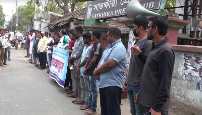 সাতক্ষীরায় কর্মরত সাংবাদিকদের আয়োজনে মঙ্গলবার (১২ মার্চ) বেলা ১১টায় জেলা প্রেসক্লাবের সামনে এ মানববন্ধন কর্মসূচি পালিত হয় মানববন্ধনে বাংলাভিশন টিভি চ্যানেলের সাতক্ষীরা প্রতিনিধি মো. আসাদুজ্জামান আসাদের সভাপতিত্বে