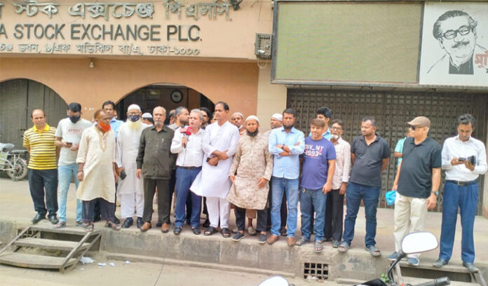 পুঁজিবাজার ডেস্ক: অব্যাহতভাবে দরপতনের প্রতিবাদে ঢাকা স্টক এক্সচেঞ্জের সামনে মানববন্ধন করে ক্ষুদ্র বিনিয়োগকারীরা। আজ মঙ্গলবার (১৯ মার্চ) বেলা ১২টার দিকে রাজধানীর মতিঝিলে ঢাকা স্টক এক্সচেঞ্জের (ডিএসই) পুরোনো ভবনের সামনে পুঁজিবাজারের চলমান ধারাবাহিক পতনের প্রতিবাদে বিনিয়োগকারীরা মানববন্ধন করেছেন। এ সময় বিভিন্ন ব্রোকারেজ হাউজের বিনিয়োগকারীরা মানববন্ধনে সমাবেত হন।