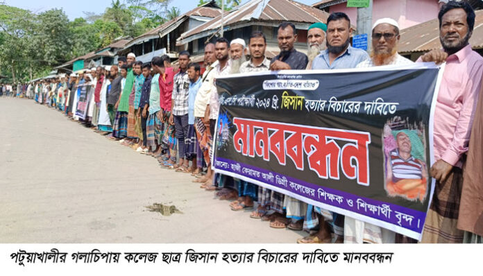 মোঃ হাফিজ,পটুয়াখালী প্রতিনিধি: ‘কিশোর গ্যাং হঠাও-দেশ বাঁচাও’ এই প্রতিপাদ্যের আলোকে পটুয়াখালীর গলাচিপায় চরবিশ্বাস কে আলী কলেজের দ্বাদশ শ্রেণির বাণিজ্যিক বিভাগের ছাত্র জিসান তার হত্যার বিচারের দাবিতে মানববন্ধন ও বিক্ষোভ কর্মসূচি পালন করা হয়েছে।