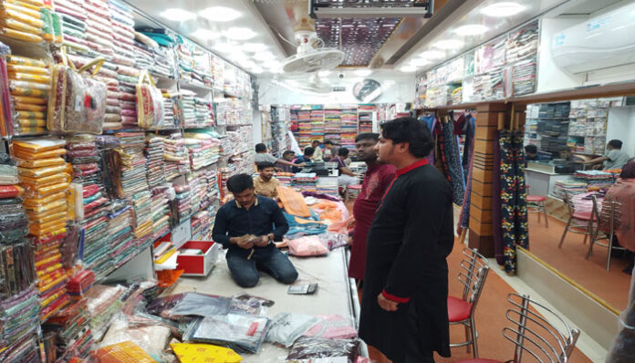 ঈদ সামনে রেখে দোকানগুলোতে নারীদের নিত্যনতুন ডিজাইনের শাড়ি বিক্রি হচ্ছে। মেয়ের থ্রিপিস, সালোয়ার-কামিজ, লেহেঙ্গা, ছিট কাপড় বেশি বিক্রি হচ্ছে। এ ছাড়া ছেলেদের গ্যাবার্ডিন প্যান্ট, হাফশার্ট, ফতুয়া ও পাঞ্জাবি বিক্রি হতে দেখা গেছে।
