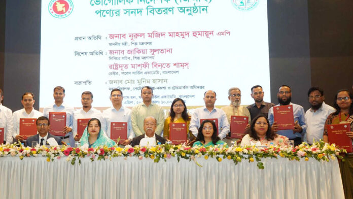 আজ বৃহস্পতিবার (২৫ এপ্রিল) রাজধানীর বেইলি রোডে বাংলাদেশ ফরেন সার্ভিস একাডেমির মাল্টিপারপাস হলে শিল্প মন্ত্রণালয়ের পেটেন্ট, শিল্প-নকশা ও ট্রেডমার্কস অধিদপ্তর (ডিপিডিটি) আয়োজিত বাংলাদেশের ঐতিহ্যবাহী টাঙ্গাইল শাড়ি, গোপালগঞ্জের রসগোল্লা ও নরসিংদীর অমৃত সাগর কলা-সহ ১৪টি ভৌগোলিক নির্দেশক (জিআই) পণ্যের নিবন্ধন সনদ বিতরণ অনুষ্ঠানে প্রধান অতিথির বক্তব্যে তিনি এসব কথা বলেন।