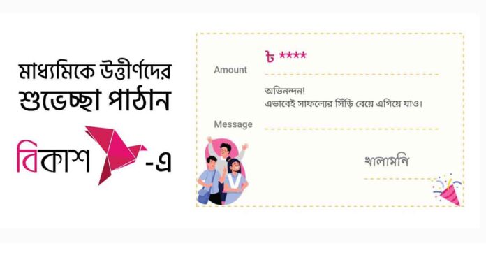 এরপর পিন দিয়ে লেনদেন সম্পন্ন করলে যাকে পাঠানো হয়েছে তাঁর কাছে অভিনন্দন বার্তা সহ শুভেচ্ছা পৌঁছে যাবে। বিকাশ অ্যাপে এসএসসি শিক্ষার্থীদের জন্য অভিনন্দন পাঠানোর এই বিশেষ সুবিধা দূরে থেকেও প্রিয়জনের আনন্দে অংশগ্রহণের সুযোগ তৈরি করে দিয়েছে।