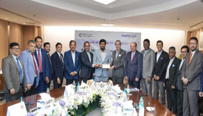 সুজাদুর রহমান, চেয়ারম্যান, প্রাইম ইন্স্যুরেন্স কোম্পানী লিমিটেড ঢাকা ব্যাংক লিঃ এর ব্যবস্থাপনা পরিচালক এমরানুল হক এর হাতে ব্যাংকার্স ব্লাংকেট বন্ড (বিবিবি) পলিসির বিপরীতে বীমা দাবীর ১,৮২,৮৭,৫৮৭ টাকার চেক হস্তান্তর করেন।
