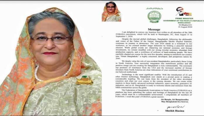 ইমা এলিস/ নিউ ইয়র্ক: যুক্তরাষ্ট্রের ওয়াংশিংটন ডিসিতে আগামী ৩০ আগস্ট ও ১ সেপ্টেম্বরে অনুষ্ঠিতব্য ৩৮ তম ফেডারেশন অব বাংলাদেশি অ্যাসোসিয়েশন্স ইন নর্থ আমেরিকা (ফোবানা) সম্মেলনে অংশগ্রহণকারী সকলকে আগাম শুভেচ্ছা জানিয়েছেন প্রধানমন্ত্রী শেখ হাসিনা।