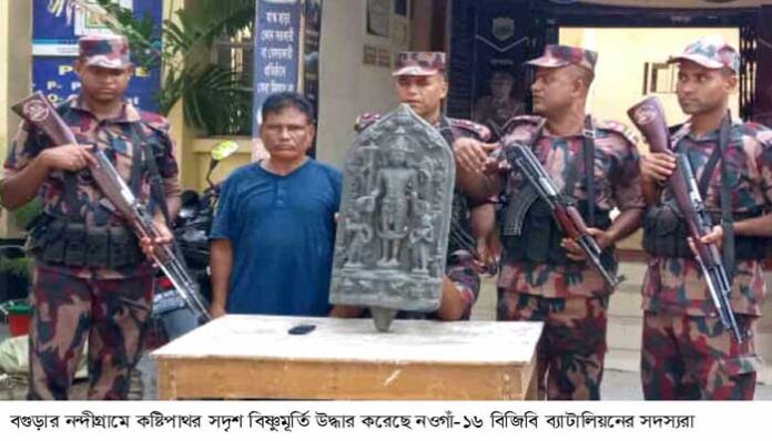 মামলার বিবরণে জানা গেছে, উদ্ধারকৃত ২৬.৫ কেজি ওজনের কষ্টিপাথর সদৃশ বিষ্ণুমূর্তির মূল্য প্রায় ২৬ লাখ ৫০ হাজার টাকা। নন্দীগ্রাম উপজেলার ভাটগ্রাম ইউনিয়নের বিজরুল এলাকার একটি বসতবাড়িতে কষ্টিপাথরের মূর্তি গোপনে রেখে বিক্রয়ের চেষ্টার তথ্য পেয়ে গত মঙ্গলবার বিজিবির একটি বিশেষ টহল দল অভিযান চালায়। বাড়ির কাছাকাছি বিজিবি সদস্যদের উপস্থিতি টেরপেয়ে একজন পালানোর চেষ্টা করে।