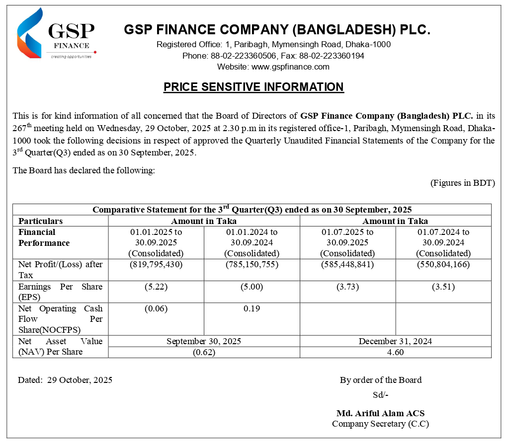 | Price Sensitive Information (Q3) of GSP Finance Company (Bangladesh) PLC. https://corporatesangbad.com/525475/ |