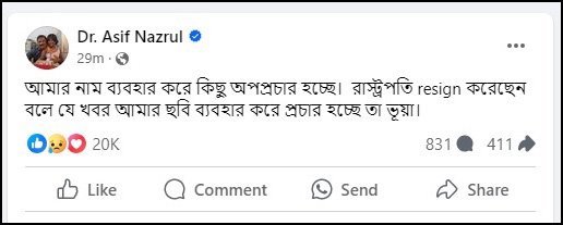 তিনি লিখেন, ‘আমার নাম ব্যবহার করে কিছু অপপ্রচার হচ্ছে। রাষ্ট্রপতি রিজাইন (পদত্যাগ) করেছেন বলে যে খবর আমার ছবি ব্যবহার করে প্রচার হচ্ছে- তা ভুয়া।’