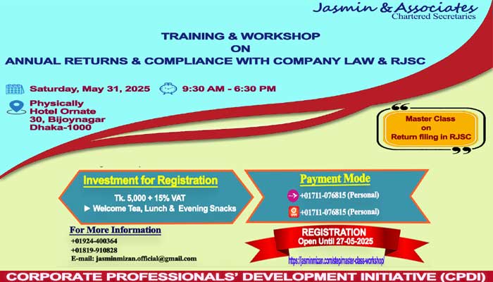 জেসমিন অ্যান্ড এসোসিয়েটসের উদ্যোগে দিনব্যাপি “অ্যানুয়াল রিটার্ন ফাইলিংয়ের মাস্টার ক্লাস ৩১ মে, শনিবার”