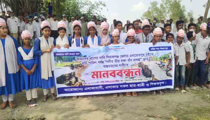 এনায়েতপুরে যমুনার তীর রক্ষা প্রকল্পের কাজ সমাপ্তির দাবিতে মানববন্ধন