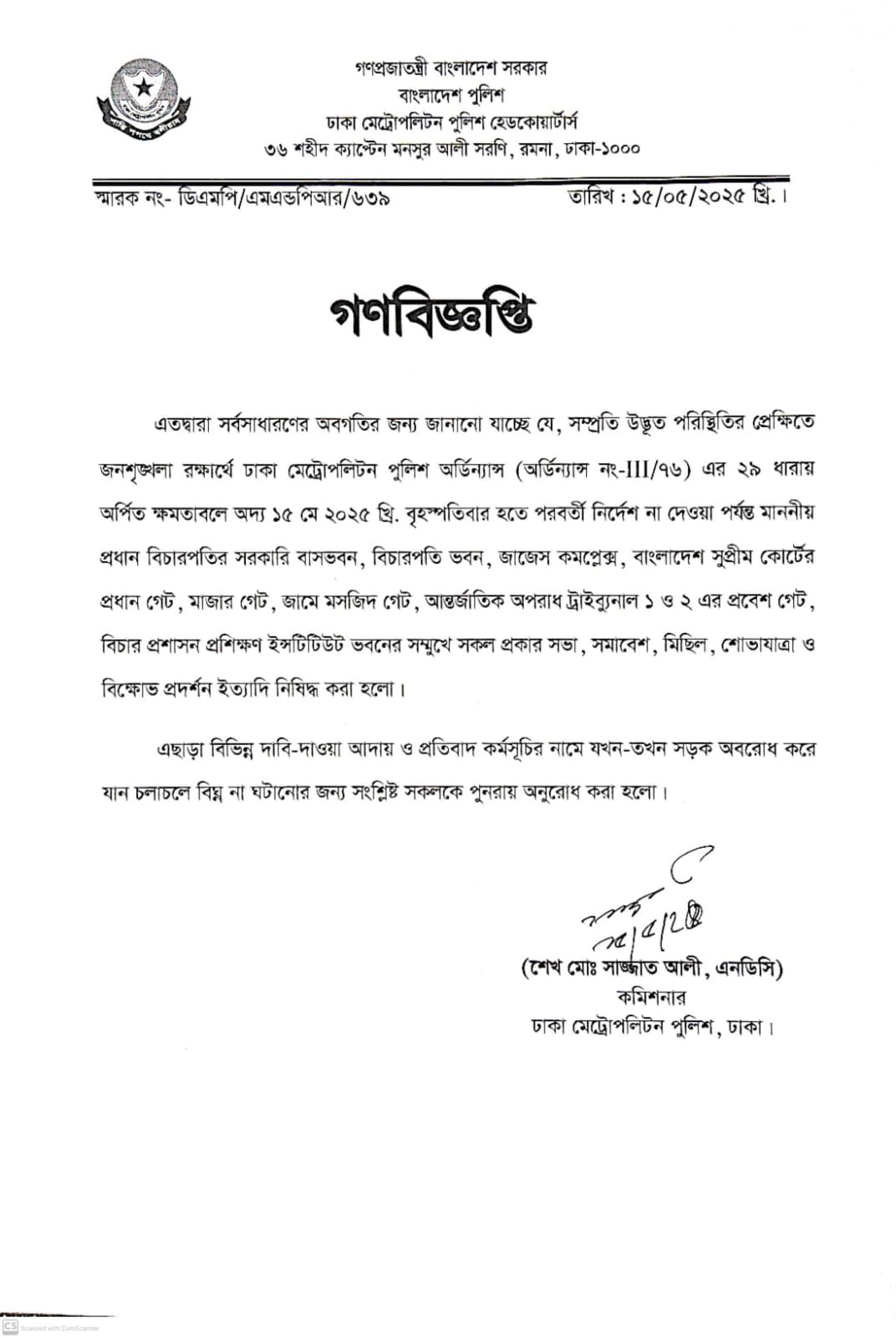 গণবিজ্ঞপ্তি বলা হয়েছে, এতদ্বারা সর্বসাধারণের অবগতির জন্য জানানো যাচ্ছে যে, সম্প্রতি উদ্ভূত পরিস্থিতির প্রেক্ষিতে জনশৃঙ্খলা রক্ষার্থে ঢাকা মেট্রোপলিটন পুলিশ অর্ডিন্যান্স (অর্ডিন্যান্স নং-III/৭৬) এর ২৯ ধারায় অর্পিত ক্ষমতাবলে অদ্য ১৫ মে বৃহস্পতিবার হতে পরবর্তী নির্দেশ না দেয়া পর্যন্ত প্রধান বিচারপতির সরকারি বাসভবন, বিচারপতি ভবন, জাজেস কমপ্লেক্স, বাংলাদেশ সুপ্রিম কোর্টের প্রধান গেট, মাজার গেট, জামে মসজিদ গেট, আন্তর্জাতিক অপরাধ ট্রাইব্যুনাল ১ ও ২ এর প্রবেশ গেট, বিচার প্রশাসন প্রশিক্ষণ ইন্সটিটিউট ভবনের সম্মুখে সকল প্রকার সভা, সমাবেশ, মিছিল, শোভাযাত্রা ও বিক্ষোভ প্রদর্শন ইত্যাদি নিষিদ্ধ করা হলো।