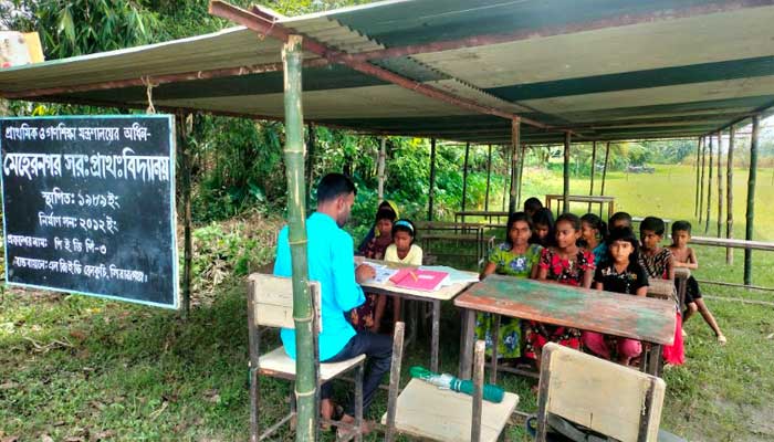 নদী গর্ভে বিদ্যালয়, খোলা মাঠে টিনের ছাউনির নিচে পাঠদান