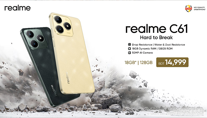 ‘হার্ড টু ব্রেক’ স্থায়িত্ব নিয়ে স্মার্টফোনের বাজারে এলো রিয়েলমি সি৬১