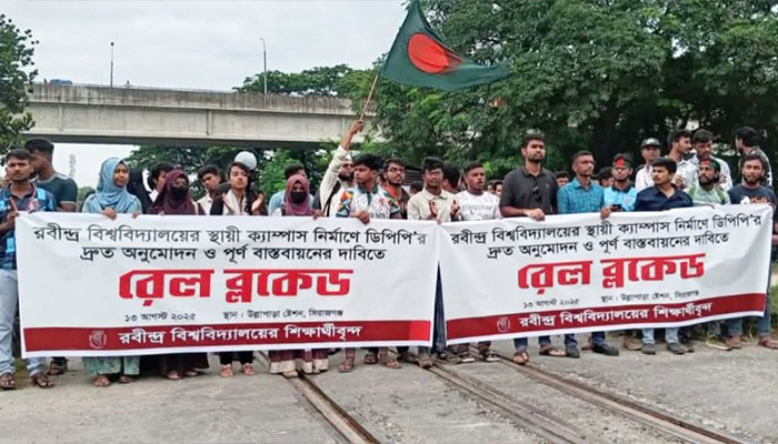 রবীন্দ্র বিশ্ববিদ্যালয় শিক্ষার্থীদের রেলপথ অবরোধে ঢাকাগামী ট্রেন চলাচল বন্ধ