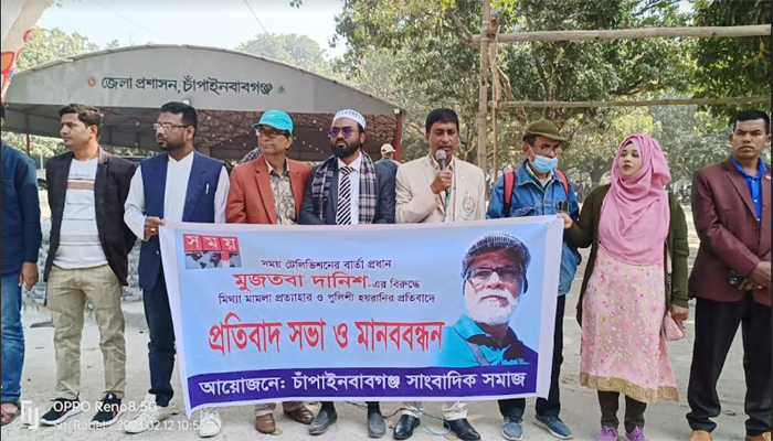 চাঁপাইনবাবগঞ্জে সময় টিভির বার্তা প্রধানের বিরুদ্ধে মিথ্যা মামলার প্রতিবাদে মানববন্ধন