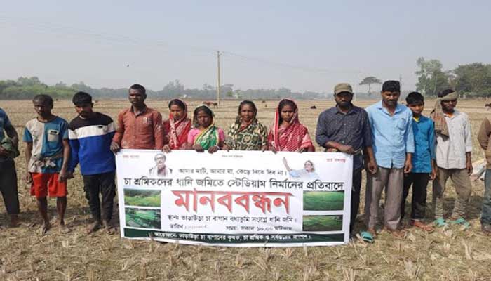ধানী জমিতে স্টেডিয়াম নির্মাণের প্রতিবাদে চা শ্রমিকদের মানববন্ধন