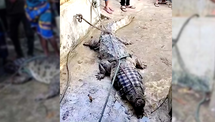 মানিকগঞ্জে পদ্মার শাখা নদীতে স্থানীয়দের কৌশলে ধরা পড়ল কুমির!