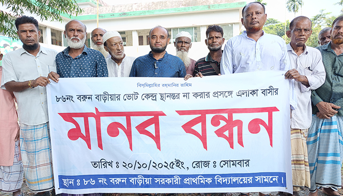 বরুন বাড়ীয়া ভোটকেন্দ্র স্থানান্তরের সিদ্ধান্তের প্রতিবাদে এলাকাবাসীর মানববন্ধন