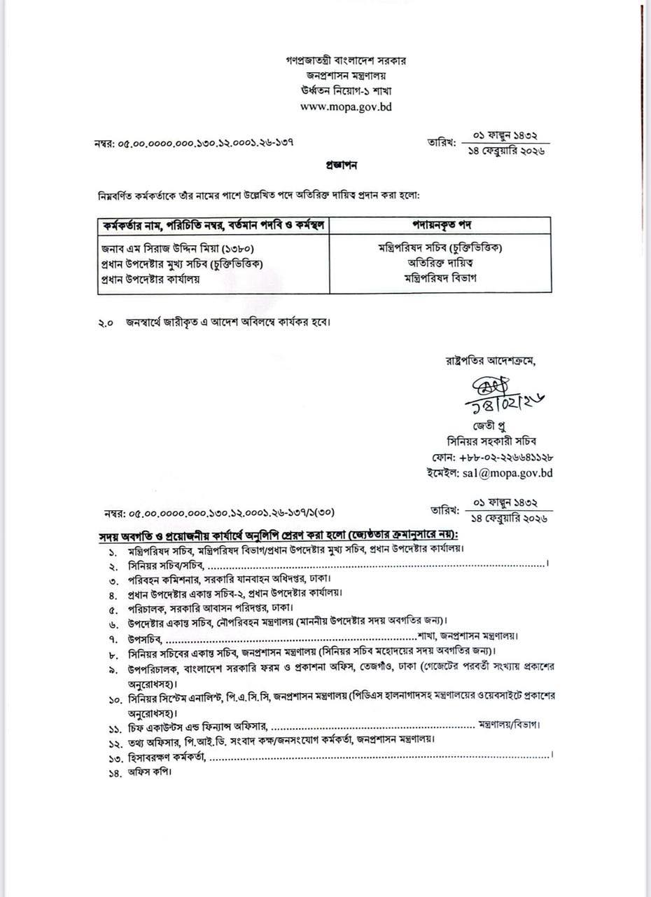 প্রধান উপদেষ্টার মুখ্য সচিব (চুক্তিভিত্তিক) এম সিরাজ উদ্দিন মিয়াকে মন্ত্রিপরিষদ সচিব হিসেবে অতিরিক্ত দায়িত্ব দেয়া হয়েছে।