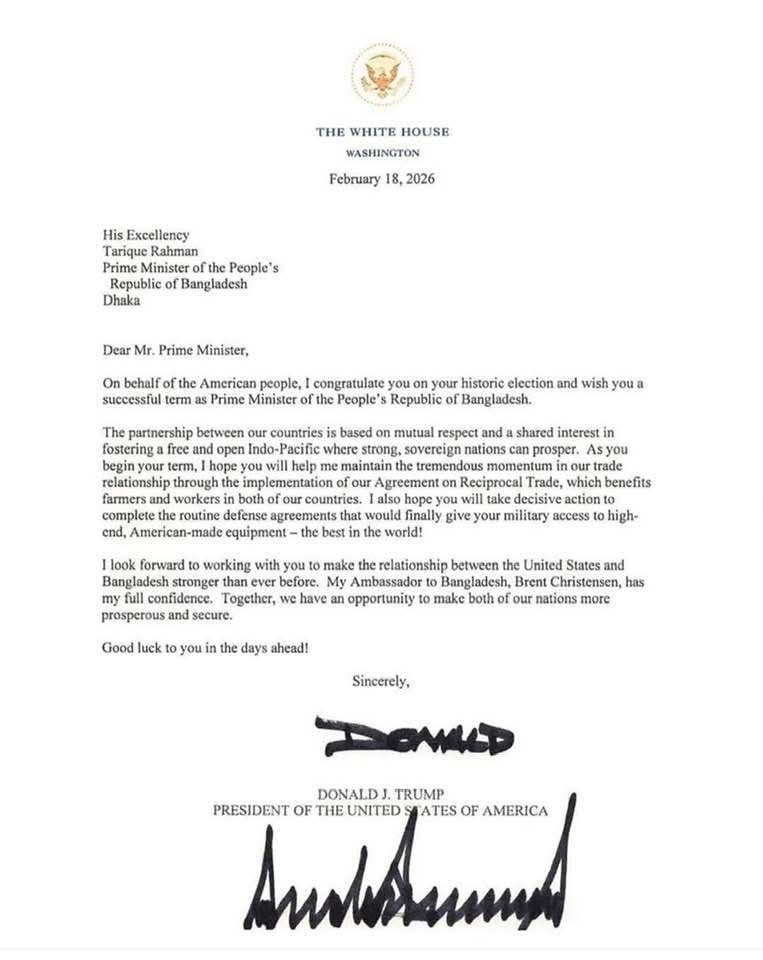 বাংলাদেশের প্রধানমন্ত্রী হিসেবে দায়িত্ব গ্রহণ করায় বিএনপি চেয়ারম্যান তারেক রহমানকে উষ্ণ অভিনন্দন জানিয়েছেন যুক্তরাষ্ট্রের প্রেসিডেন্ট ডোনাল্ড ট্রাম্প। স্থানীয় সময় মঙ্গলবার (১৮ ফেব্রুয়ারি) হোয়াইট হাউস থেকে পাঠানো এক চিঠিতে তিনি এই অভিনন্দন জানান।