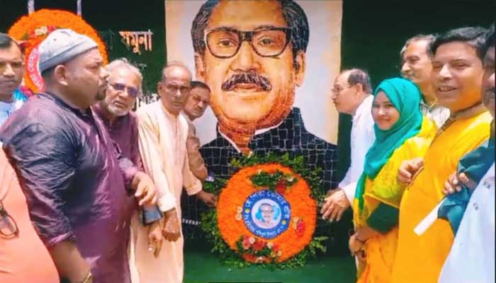 আ.লীগের প্লাটিনাম জয়ন্তীতে বঙ্গবন্ধুর প্রতিকৃতিতে শ্রদ্ধা